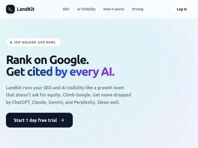 LandKit runs your SEO and AI visibility like a growth team, helping you rank on Google and get cited by ChatGPT, Claude, Gemini, and Perplexity.