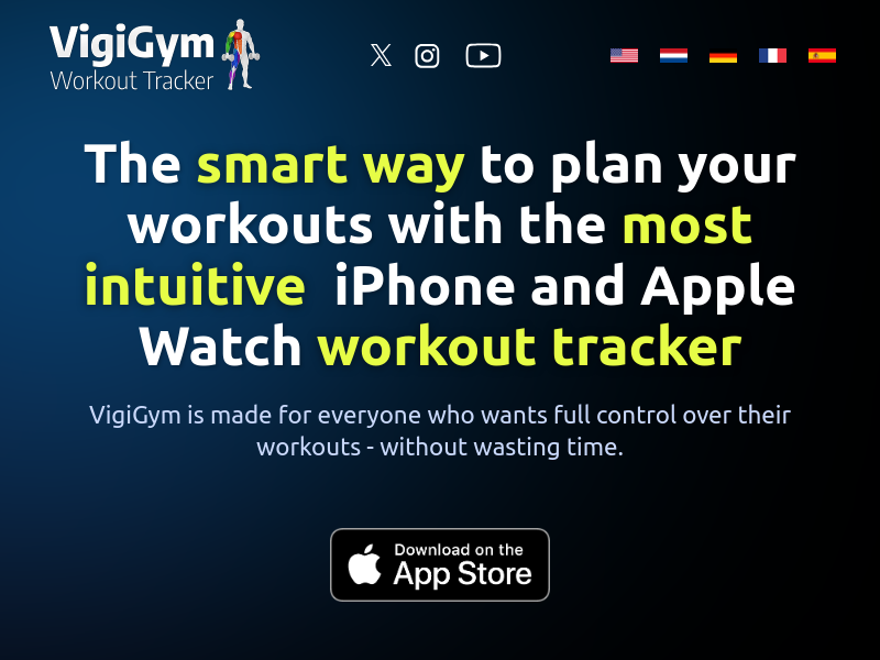 VigiGym is a smart workout tracker app for iPhone and Apple Watch, designed for self-guided lifters to plan and track workouts with precision.