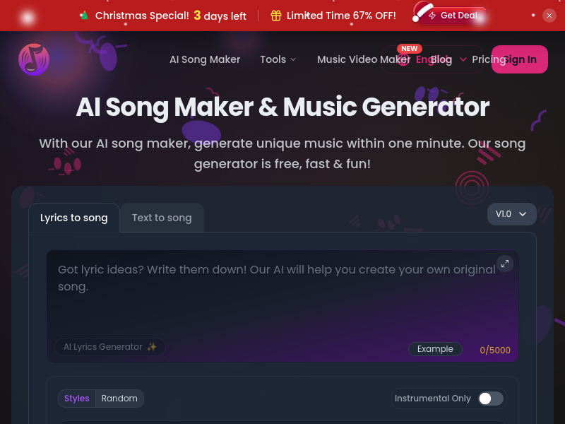 AI Make Song is an AI song generator and music maker that helps anyone create professional-quality music in minutes from text or lyrics.